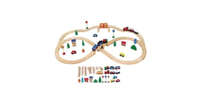 Un chemin de fer en bois composé d'une multitude de pièces ludiques et amusantes.