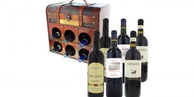 Le coffre a un double avantage. Dans la partie supérieure, il y a un compartiment spacieux pour y ranger tous les accessoires utiles à la dégustation du vin, puis vous pouvez également y ranger 6 bouteilles de vins de 0,75 l et 1 l. Le coffre, à l'achat, contient 2 bouteilles de Bordeaux Barons de Rothschild (Lafite), 2 bouteilles de Chianti L'Acciano et 2 bouteilles de Valdepeñas José de Zarzas Reserva.