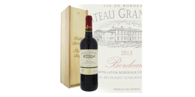 Bouteille de Bordeaux Château Grand-Jean 2019. Les coffres sont personnalisables avec un texte de votre choix.