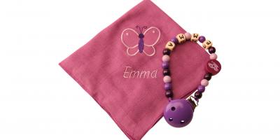 Grâce à ses nombreuses couleurs et au nom brodé (max: 10 symboles) votre doudou et votre attache-tétine seront unique!