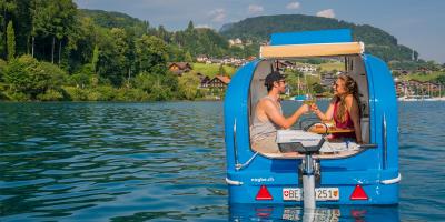 Profitez d'une balade et d'un apéritif sur le lac de Thoune à bord d'un véhicule amphibie : cette expérience unique vous attend à Faulensee. Après une petite introduction, vous pourrez prendre la barre et partir à l'aventure au fil de l'eau. Ajoutez à cela un verre de mousseux de la région de Spiez et rafraîchissez-vous en faisant un petit saut dans l'eau.