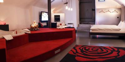 Appréciez une nuit dans la merveilleuse „Rosen Suite“. De plus, vous vous détendrez pendant de longues heures dans le jacuzzi. Et pour finir, un minibar renfermant une surprise pétillante vous attend dans la chambre avec un délicieux petit déjeuner. De la détente à l’état pur !