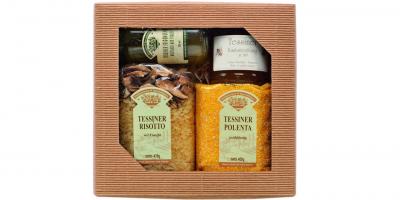 Le coffret cadeau Ticinella vous gâtera avec le meilleur risotto, de la polenta, de la moutarde aux figues et du miel aux châtaignes. Un vrai régal!