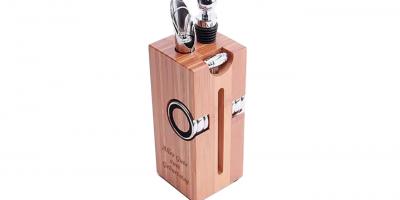 Le set d'accessoires à vin avec son bloc en bambou personnalisable est une grande idée de cadeau.