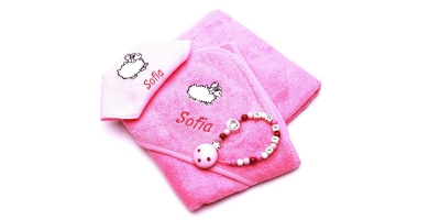 Ce superbe set cadeau pour bébé est personnalisable et comprend un linge de bain à capuche, une patte pour bébé ainsi qu'une chaîne à lolette.