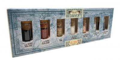 Vous aimez pimenter votre nourriture ? Êtes-vous ouvert à de nouveaux goûts ? Alors ce set est fait pour vous ! Car vous obtiendrez littéralement une gamme de différents sels de toutes les couleurs : le sel noir de Chypre, le sel marin d'Hawaï, le sel bleu d'Iran, le sel gemme rose du Pakistan et bien d'autres sels internationaux. Goûtez les différents pays à travers le sel et affinez vos plats selon votre humeur.