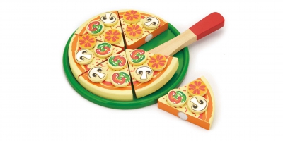 Pizza en bois peinte à la main. Garnissez la pizza avec diverses garnitures.